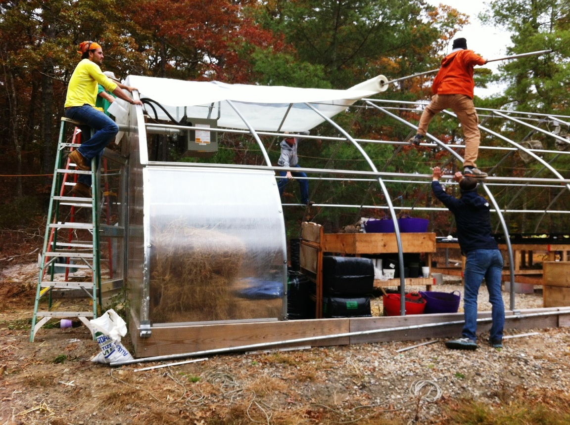 The biggest news, though, was that we pulled off the old plastic cover on the greenhouse, which was damaged a year ago this weekend during Hurricane Sandy, and we replaced it with a fresh roll.