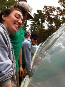 During our work day, we cleared up a whole bunch of beds that had been home to frost-sensitive plants like tomatoes and beans. In each bed, we added lime (to help neutralize the acidic Cape Cod soil), we turned in composted goat bedding (to boost nutrients), and we mulched with straw (to keep the soil and nutrients from washing away during big storms over the winter). We placed protective fabric over a few rows to squeeze one more harvest out of the plants before the cold set in, and we built a mini-greenhouse over one row as an experiment in season extension.