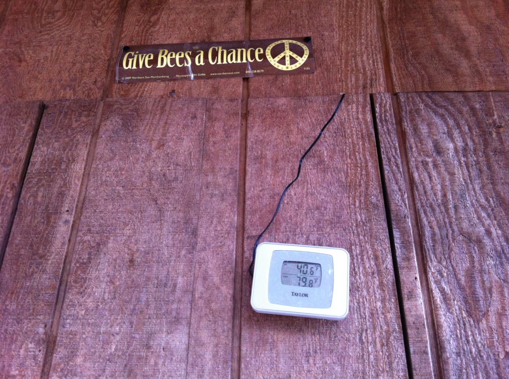 The observation hive recently got a space heater and a thermometer, so we can easily see whether the weather is up to scratch (as it is here — a toasty nearly-80 degrees as compared to the outdoor 40!).